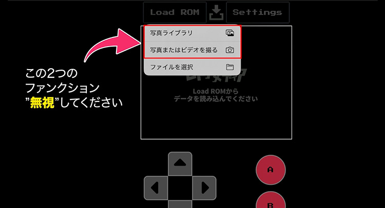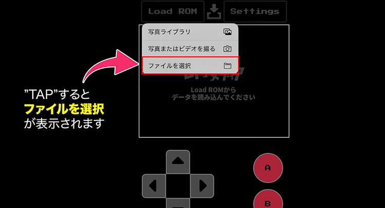 タップ後、「ファイルを選択」を選んでROMを指定してください。